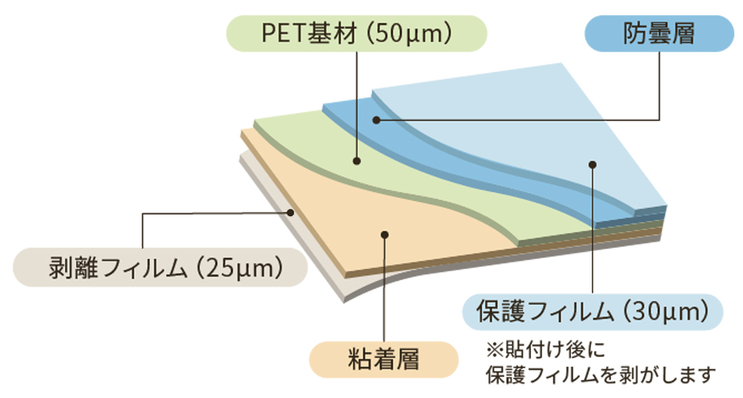 この防曇フィルムは「乾式タイプ」と呼ばれる特殊機能フィルムで、その表面に付着した水分を吸収するという特殊な機能により、くもり止めの効果を発揮します。